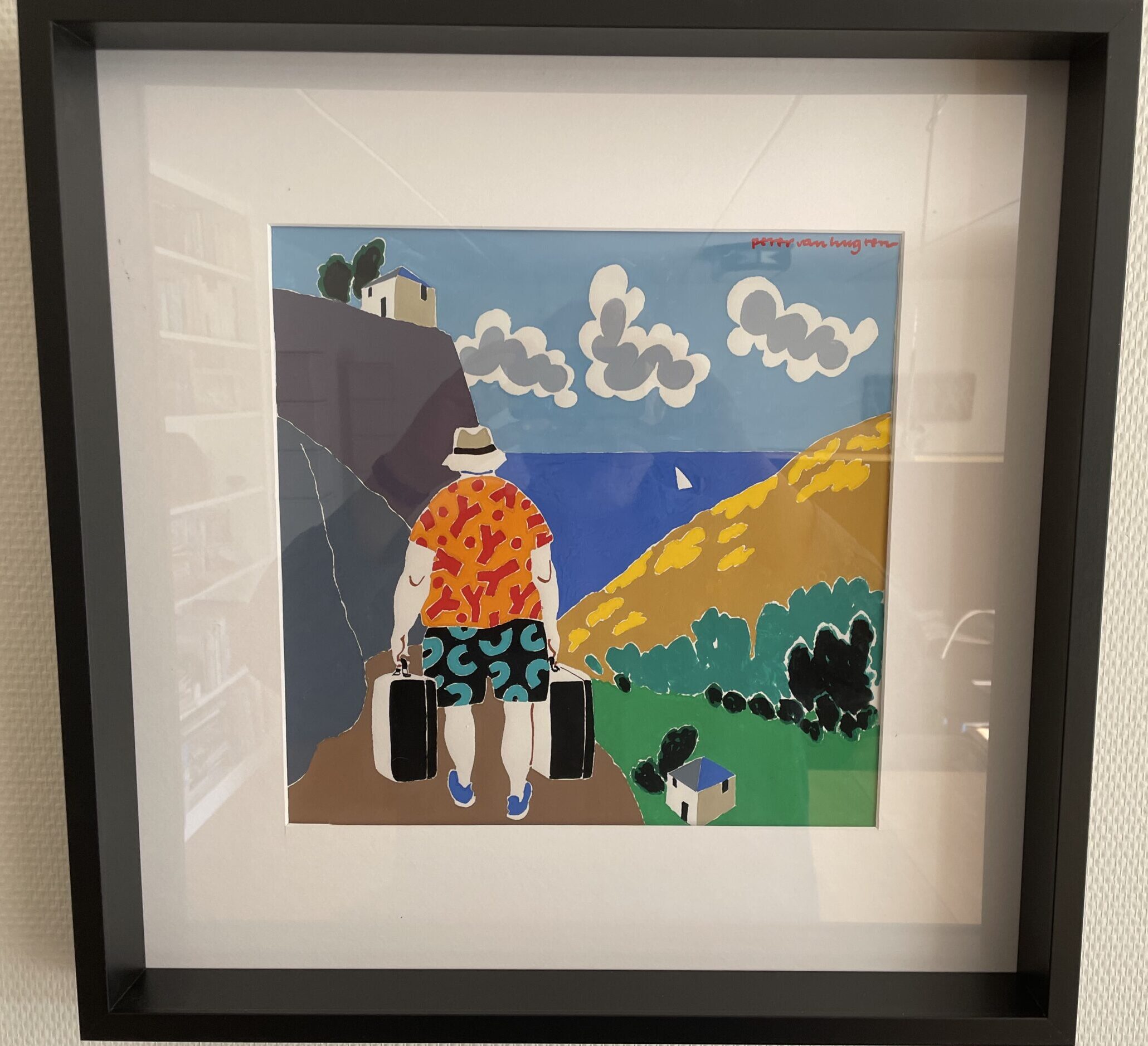 Wie weleens bij ons heeft geplast herinnert zich misschien een klein ingelijst plaatje dat aan de wand van de wc hangt. We zien een toerist die is aangekomen op zijn bestemming en tevreden kijkt naar de plek waar hij de komende tijd vakantie gaat vieren. Het is een afbeelding die uit de krant is geknipt, een mooi plaatje van Peter van Hugten. Van Hugten was illustrator bij de Volkskrant, zijn werk was altijd direct herkenbaar vanwege zijn volstrekt eigen stijl.